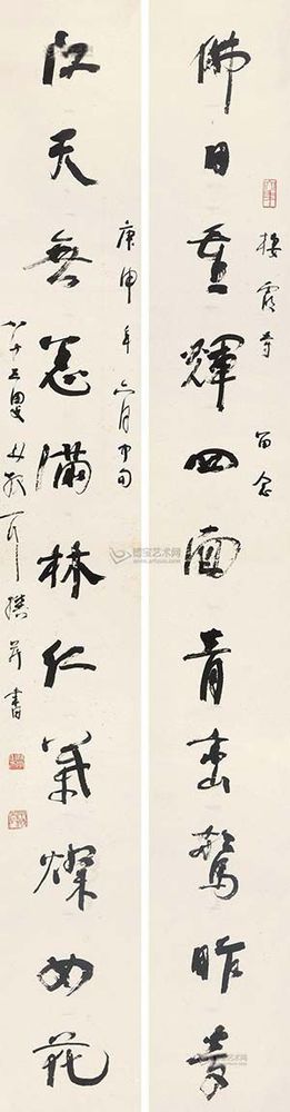 北京匡時(shí)國際拍賣有限公司描述稱,林散之先生的這副作品作于1980年,為棲霞寺所書,林氏時(shí)年83歲,已是人書俱老的時(shí)期……林散之筆下的線條曲中有直,直中寓曲,剛中有柔,柔中寓剛,從而達(dá)到一種清逸虛妙之境。林散之的草書風(fēng)格雖然欹正相生,但往往會把其中的變化復(fù)歸平正,偏能得中,奇而能穩(wěn),故顯得格外的老成與持重。由于林散之的藝術(shù)思想受佛家影響較深,而此為“三論宗”的發(fā)源地棲霞寺所書,更能見其書寫之虔誠。