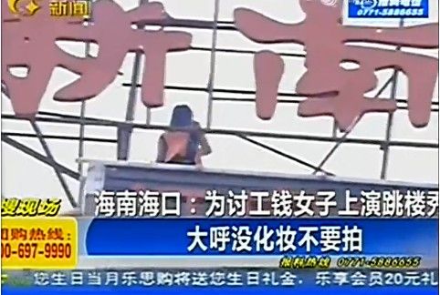 法制晚報(bào):【女子跳樓見記者拍攝:“我沒(méi)化妝不要拍”】近日,海口一名女子為討工錢上演跳樓秀。她坐在大樓樓頂?shù)膹V告牌前,用手抓住廣告牌鐵架,神情激動(dòng)。警方和救護(hù)人員做好準(zhǔn)備隨時(shí)出動(dòng)救援。見到記者拍攝,女子大喊:不要拍了!我今天沒(méi)有化妝,不夠漂亮,很難看!