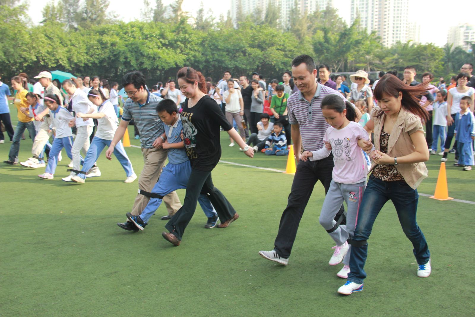 游戲規(guī)則:活動(dòng)分組進(jìn)行,每個(gè)家庭(兩大一小)為一組,家長(zhǎng)在兩邊,孩子在中間,家長(zhǎng)和孩子相鄰的兩條腿用10cm寬,60cm長(zhǎng)的紅色布條綁住,聽到口令后,三人一齊向前跑,看誰先跑到終點(diǎn)為勝。(每組最多為5個(gè)家庭參與,活動(dòng)分三組進(jìn)行)