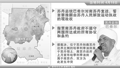 今年3月,雙邊談判取得進展,草簽了關于邊境劃界和國民地位兩份協(xié)議,并商定在4月初舉行兩國領導人會晤,當時有報道樂觀地認為,“兩國糾紛將在兩個月內(nèi)得到徹底解決”。然而,南蘇丹總統(tǒng)基爾3月26日突然宣布,哈季利季屬于南蘇丹,蘇丹侵略了該國領土,南蘇丹要予以反擊。隨后,兩國陳兵哈季利季,并時有交火,直到4月11日,南蘇丹軍隊攻占了這一地區(qū)。
