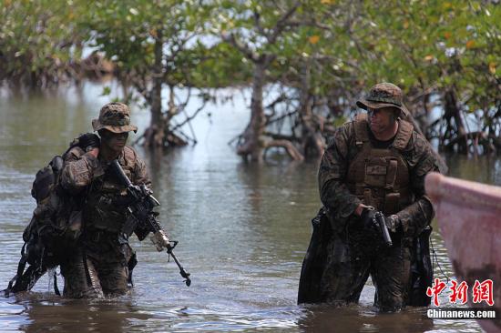 4月25日,美國(guó)與菲律賓“肩并肩2012”聯(lián)合軍演參演部隊(duì)在菲律賓南部巴拉望省普林塞薩港市的阿魯甘灣舉行“兩棲登陸”演練,美菲雙方近百名海軍陸戰(zhàn)隊(duì)士兵參加。這也是美菲“肩并肩2012”聯(lián)合軍演開幕10天以來,開放媒體采訪規(guī)模最大的一場(chǎng)軍事演習(xí)活動(dòng)。圖為美菲海軍陸戰(zhàn)隊(duì)先遣小分隊(duì)登上灘頭。記者張明攝