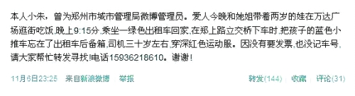 前天23時25分,一位微博名叫“勤行者有志”的網(wǎng)友發(fā)布了一條微博,稱自己是“小朱”,曾為鄭州市城市管理局微博管理員,妻姐把一輛藍(lán)色的嬰兒推車落在了出租車后備廂,希望大家?guī)兔ふ摇?/p>