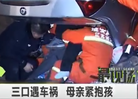 三口遇車禍 母親緊抱孩