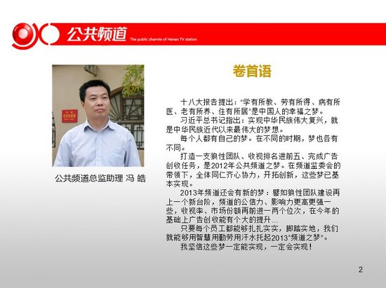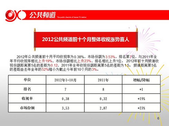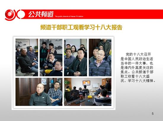頻道干部職工觀看學(xué)習(xí)十八大報(bào)告,2012公共頻道前十個(gè)月整體收視漲勢(shì)喜人,頻道與臺(tái)研發(fā)部共同參加MTP中高層干部管理技能培訓(xùn)。