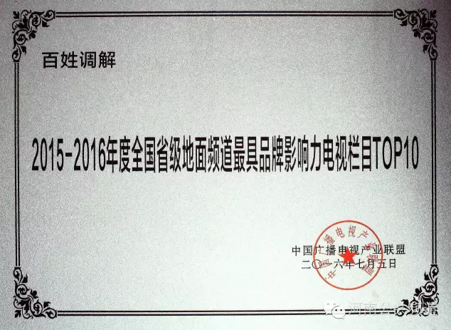 《百姓調(diào)解》欄目榮獲2015-2016年度全國(guó)省級(jí)地面頻道最具品牌影響力電視欄目TOP10。