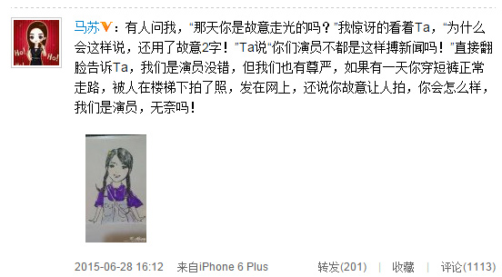 前天(6月26日),演員馬蘇參加某代言活動,下樓梯時被媒體拍到,稱其“疑似走光露臀部”。6月28日下午,馬蘇在微博公開回應(yīng)此事,稱“演員也有尊嚴”。