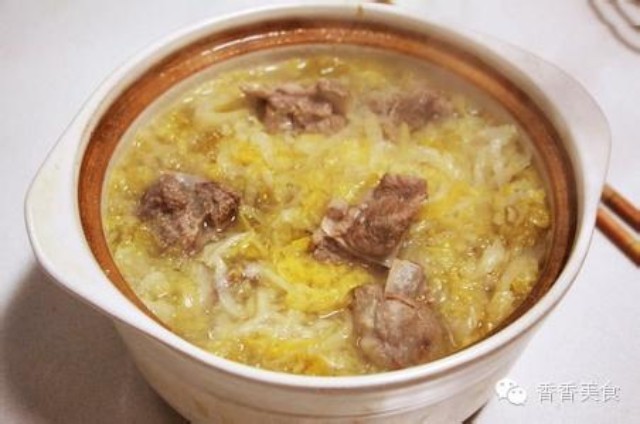 1、先將排骨過開水燙去血沫。買來的酸菜切小塊,將酸菜的厚幫子片成薄片,在冷水中浸泡一會(huì)兒。蔥姜切沫。