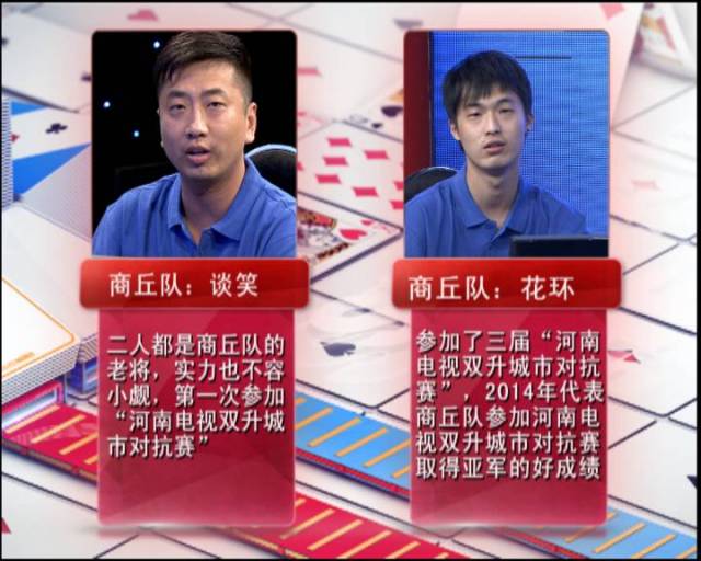 商丘隊派出了“花環(huán)”和“談笑”。兩人都是商丘隊的老將,實力不容小覷。“花環(huán)”曾參加三屆“河南電視雙升城市對抗賽”;2014年代表商丘隊參加“河南電視雙升城市對抗賽”,并取得亞軍的好成績?!罢勑Α钡谝淮螀⒓印昂幽想娨曤p升城市對抗賽”。