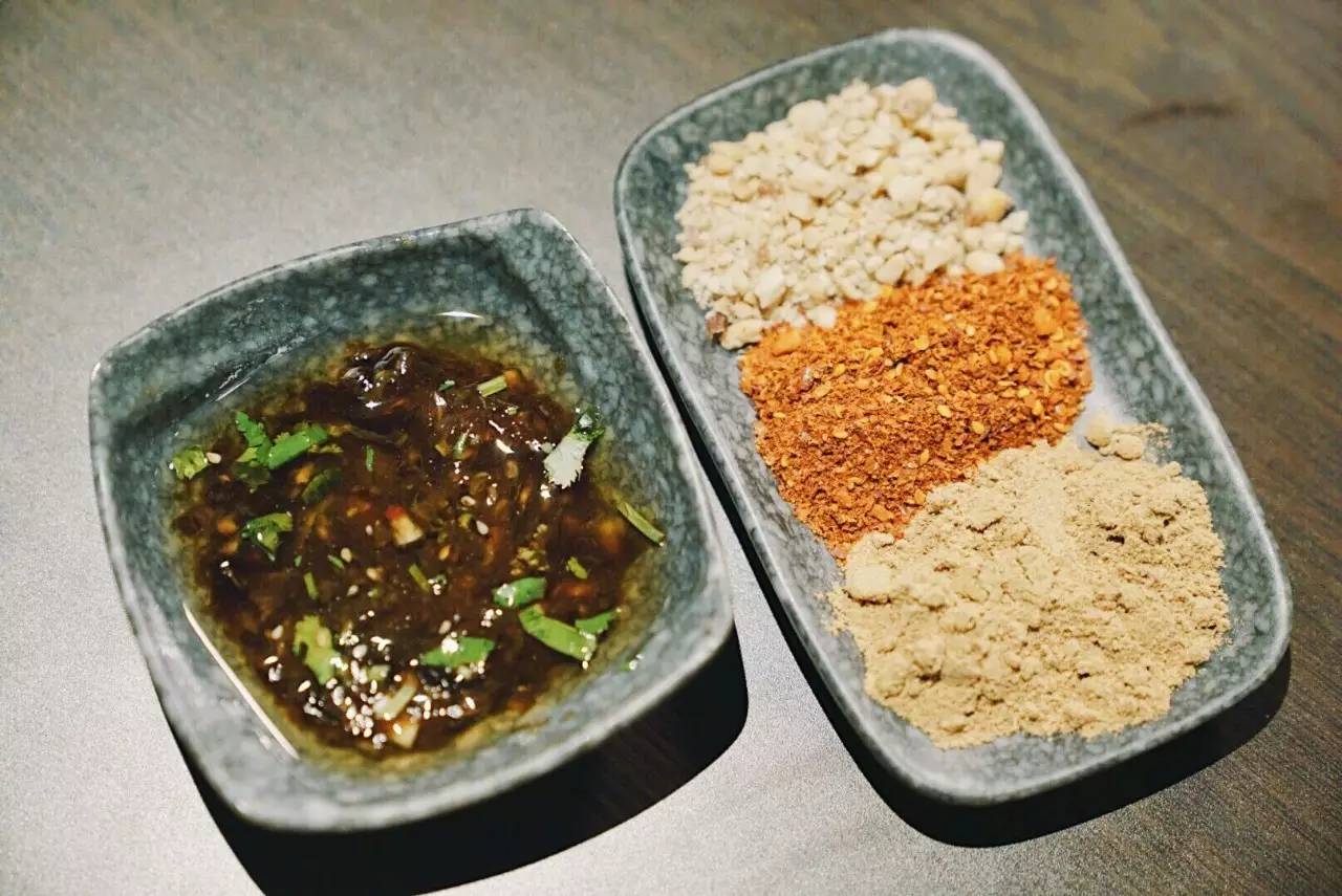 蘸料分為干碟和油碟(別找了,沒有芝麻醬),干碟里是花生碎、辣椒碎、豆粉;油碟里是香油、蠔油、蒜末,配上蔥花和香菜。蠔油可謂油碟的靈魂,是店家調制好的,可以根據(jù)自己喜好增減。