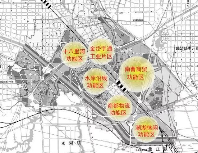 商都新區(qū)沒有單一明確的功能劃分,整個區(qū)域從北到南依次分為六大功能區(qū),包括包括金岱宇通工業(yè)片區(qū),十八里河功能區(qū),水岸沿線功能區(qū),商都物流園功能區(qū),南曹商貿(mào)功能區(qū)和潮湖休閑功能區(qū)。