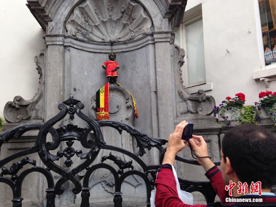 6月17日晚,歐洲“紅魔”比利時隊以2比1戰(zhàn)勝巴西世界杯首個對手阿爾及利亞隊。在比利時首都布魯塞爾,著名的城市標志“小尿童”于連雕像換上了比利時隊隊服,并圍上球迷圍巾,化身紅魔球迷支持比利時隊。