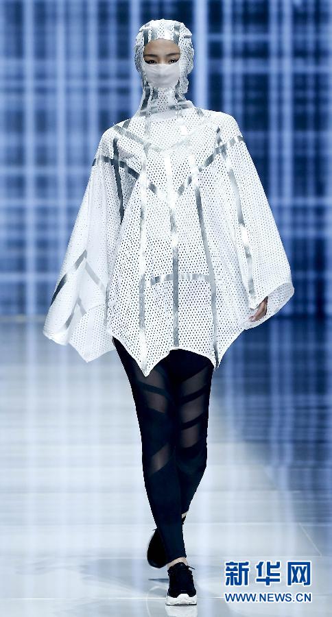 10月28日,模特在北京舉行的中國國際時裝周“喬丹·尹鵬運動裝發(fā)布會”上,展示設(shè)計師尹鵬設(shè)計的搭配各種“口罩”的運動裝。新華社記者陳建力攝