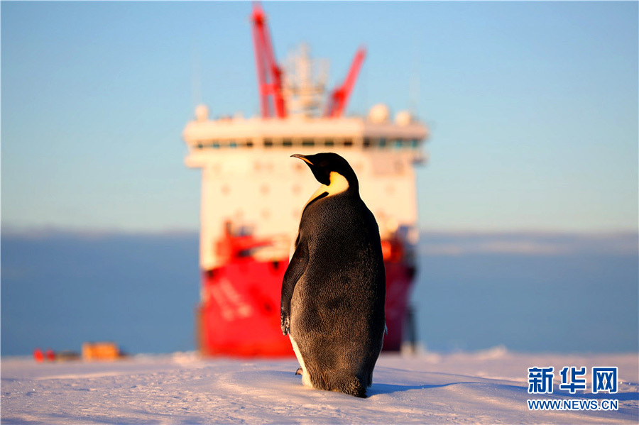 12月7日,一只帝企鵝在展開卸貨作業(yè)的“雪龍”號(hào)旁。 “雪龍”號(hào)自12月1日起在中山站外陸緣冰地帶展開冰上卸貨作業(yè),預(yù)計(jì)將于12日離開,前往羅斯海域開展大洋調(diào)查。 新華社記者 白陽 攝