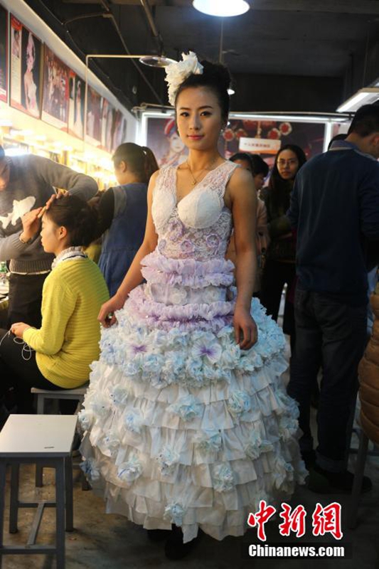 1月12日,成都職業(yè)技術(shù)學(xué)院數(shù)十名大學(xué)生將自己設(shè)計的期末作品——紙婚紗穿上展示,這些作品都是經(jīng)過數(shù)天時間手工制作而成,以報紙、衛(wèi)生紙、成績單等作為原材料,大學(xué)生在完成個性化的婚紗定制的同時還倡行了廢物利用的環(huán)保理念。圖為大學(xué)生穿上自己的紙婚紗作品。 張浪 攝