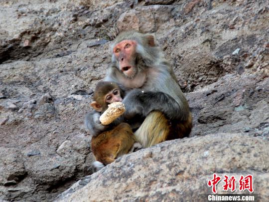 一只母猴帶著小猴在懸崖上吃玉米。 張帆 攝