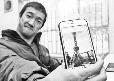 范廣照向記者展示他在上海旅游時的照片